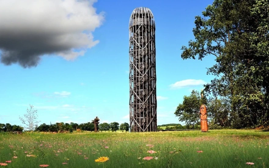 Der Aussichtsturm: Einzigartiger 25 m hoher Lärchenholzbau aus 35 m³ Holz, zusammengehalten von 12.000 Schrauben. Genießen Sie den Rundblick nach dem Aufstieg über die doppelten Treppen (99 und 90 Stufen).